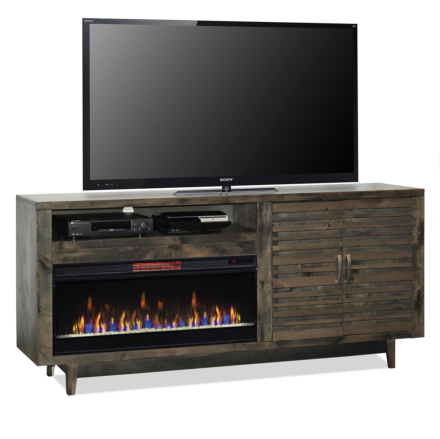 - Electric heated fireplace included with remote controlled heat and flame intensity