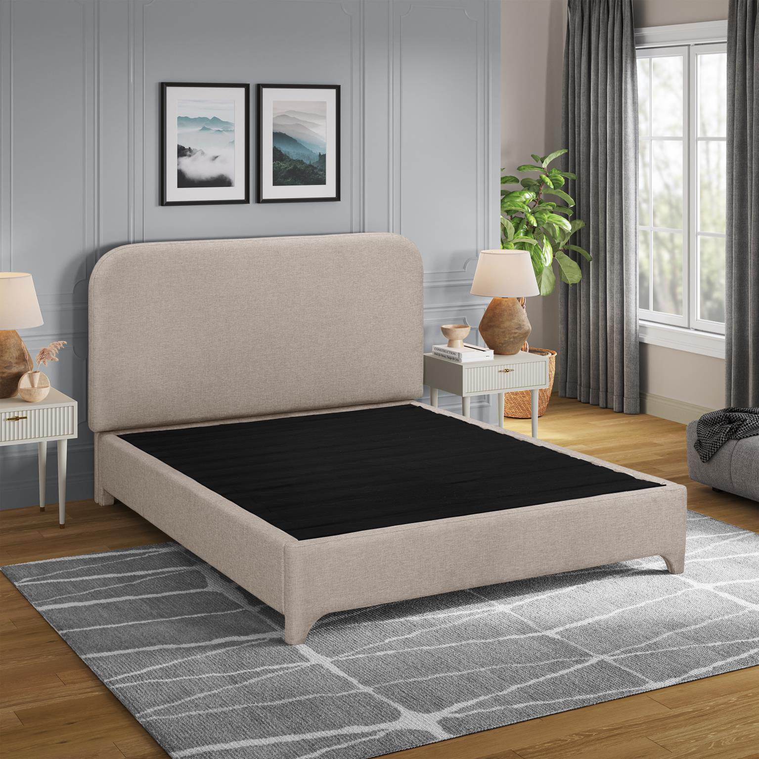 The Contempo bed set creates a fashionable foundation for any type of mattress. It serves as both a frame and a foundation, featuring sturdy legs, stout center supports, and 18 wooden slats that are woven together for easy handling and assembly.