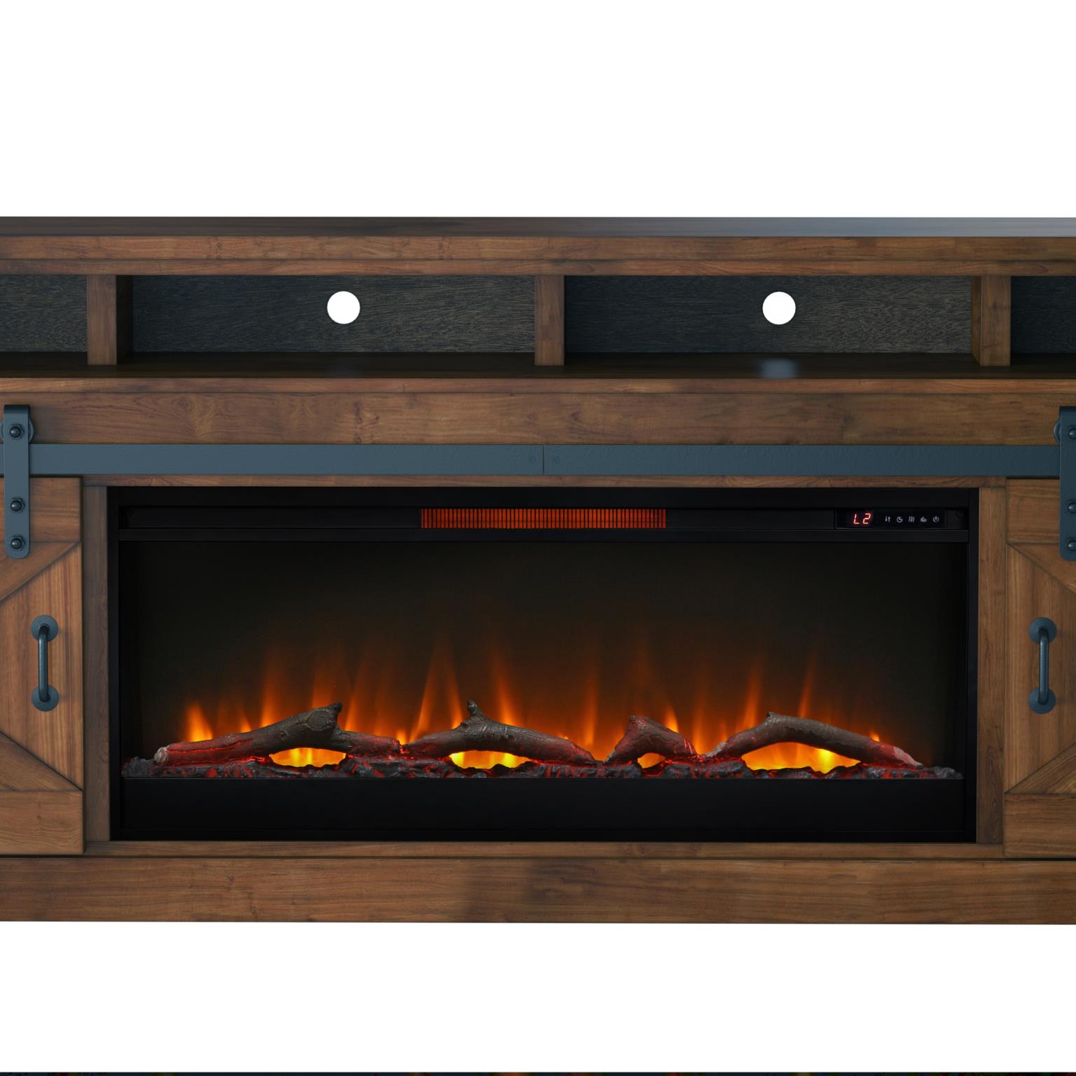 - Electric heated fireplace included with remote controlled heat and flame intensity