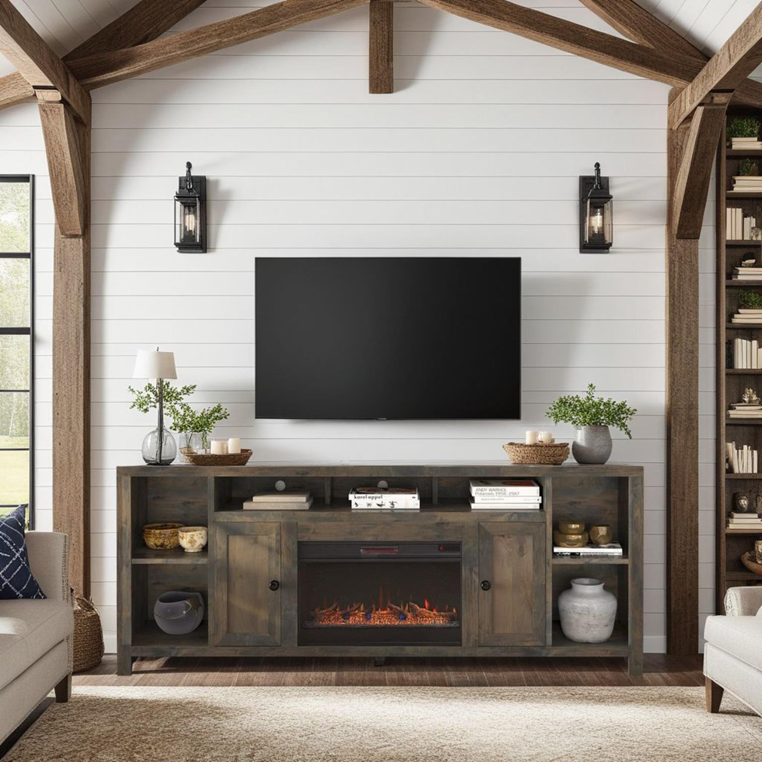 - Electric heated fireplace included with remote controlled heat and flame intensity