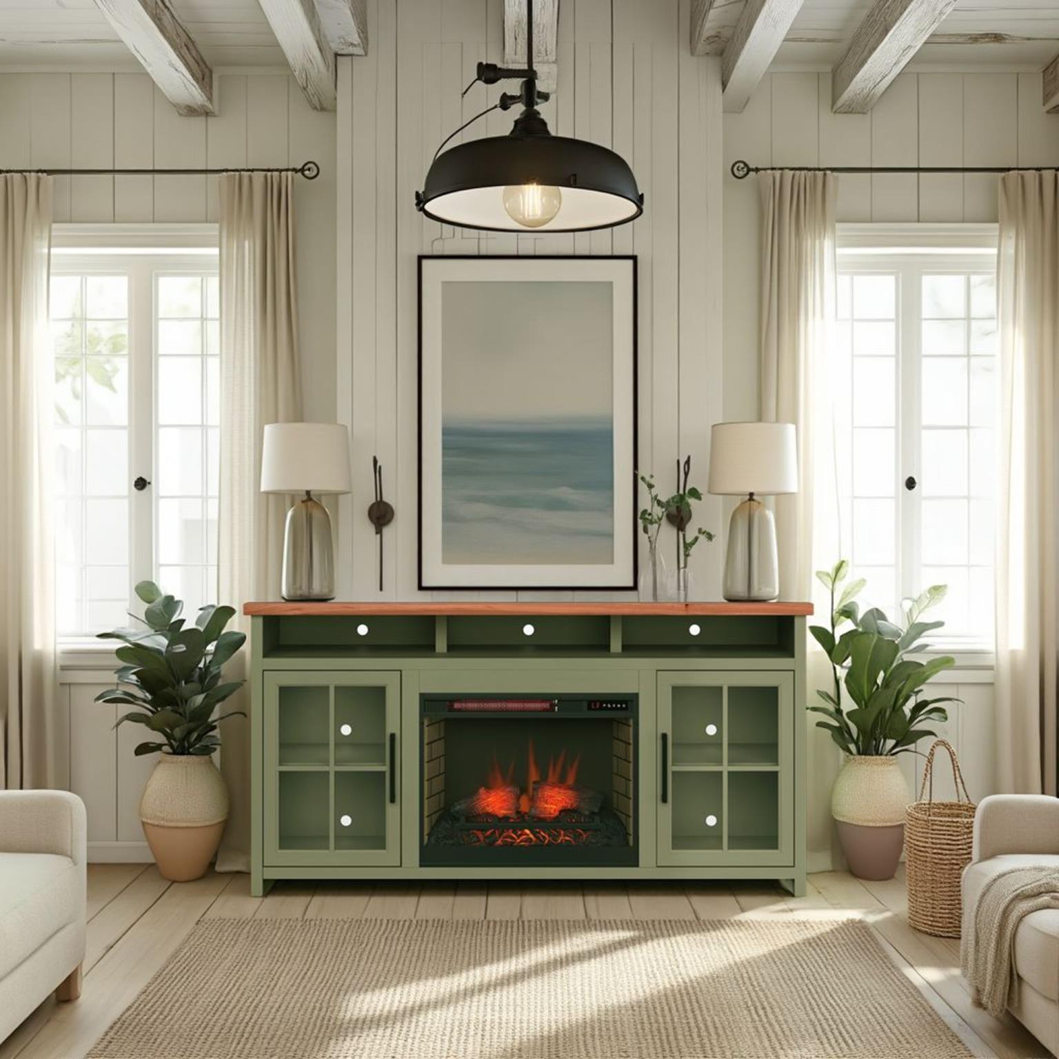 • Electric heated fireplace included with remote controlled heat and flame intensity